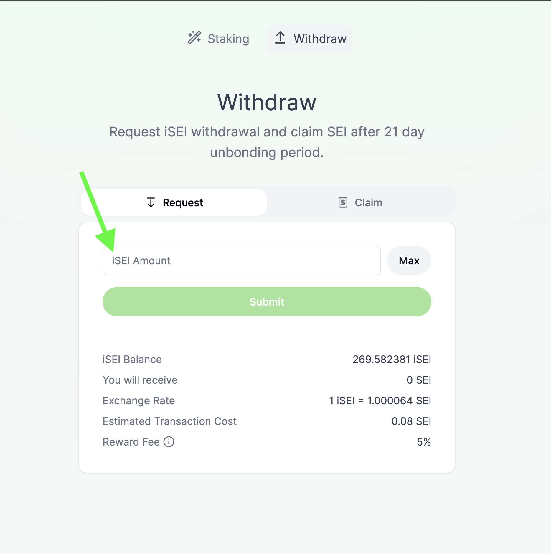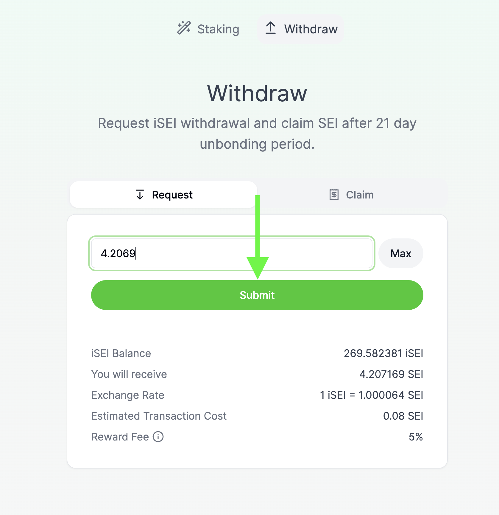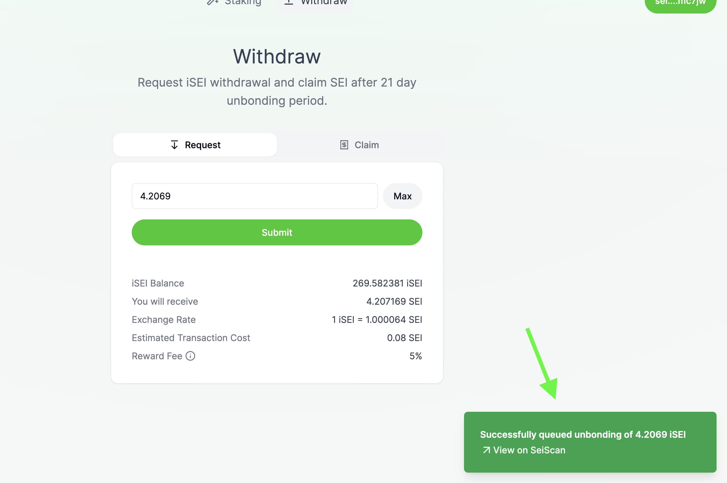 From the Withdraw page, click the "Claim" button to view your recently submitted unbonding request. This process takes 21 days. Underneath your request it will tell you the estimated time that your unbonded SEI tokens will be available for withdrawal.&#x20;